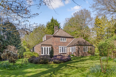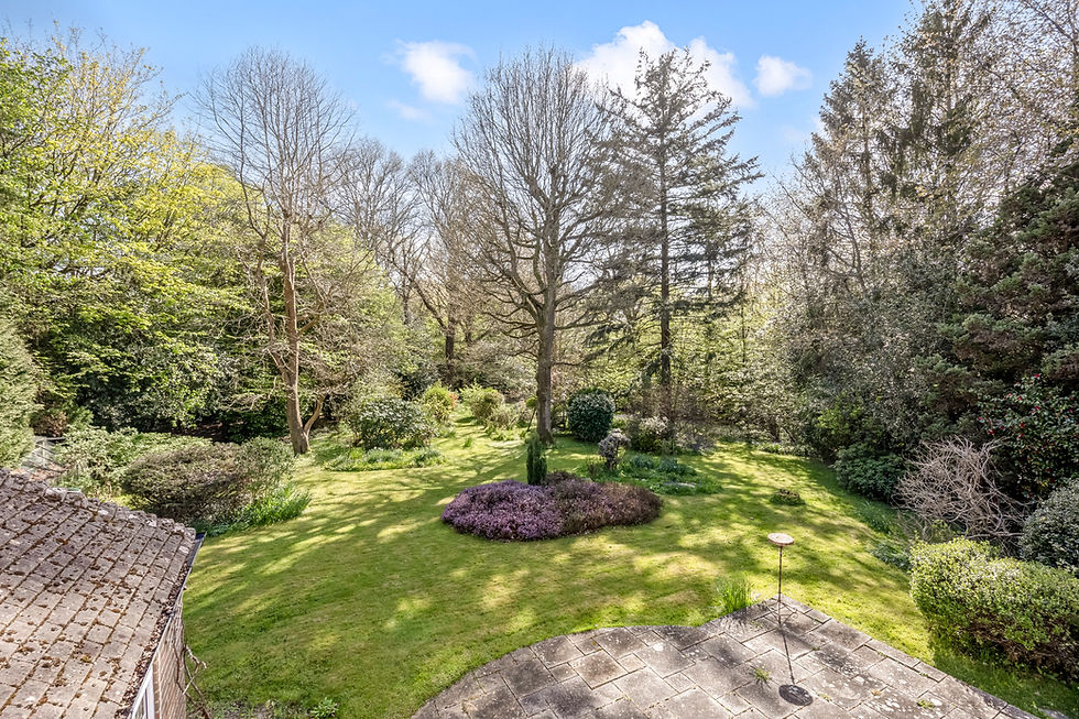 The heart of the home is an expansive 'L' shaped living and dining room. Flooded with natural light thanks to its double aspect, the room features a classic York stone fireplace and original wood block flooring. It’s a space designed for gazing out across the formal gardens toward the woods.