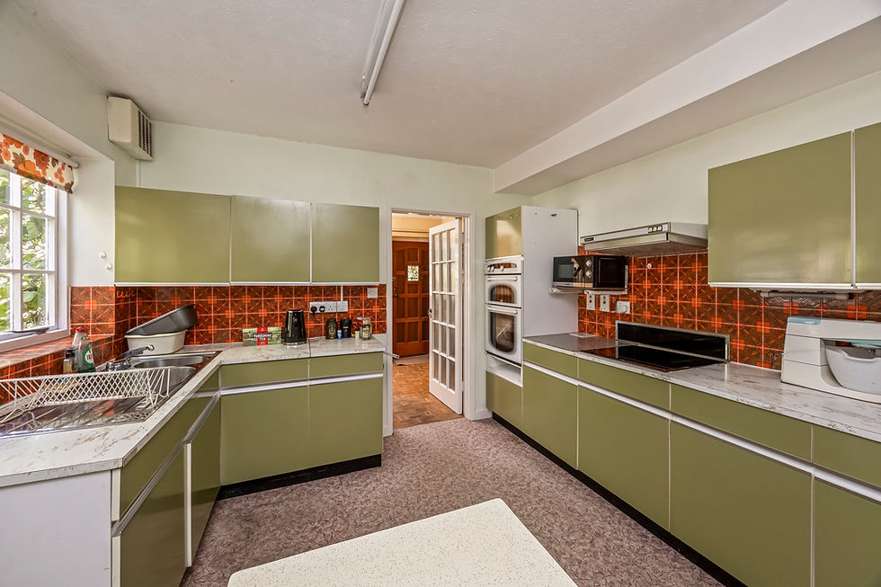 The Kitchen: A nostalgic nod to 70s design with lime-green cabinetry and integrated appliances.